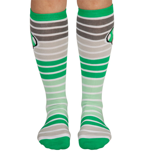 Une superbe paire de chausettes hautes rayées à l'effigie du célèbre Toad Vert de Nintendo.